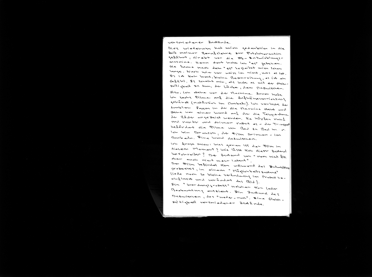 Der Film befindet sich in der Maschine, während des Entwicklungsprozesses, in einem Möglichkeitszustand (jede noch so kleine Veränderung im Prozess beeinflusst und verändert das Bild). Ein Werdungsprozess welcher sich jeder Beobachtung entzieht. Ein Zustand des Dazwischen, des weder-noch.
