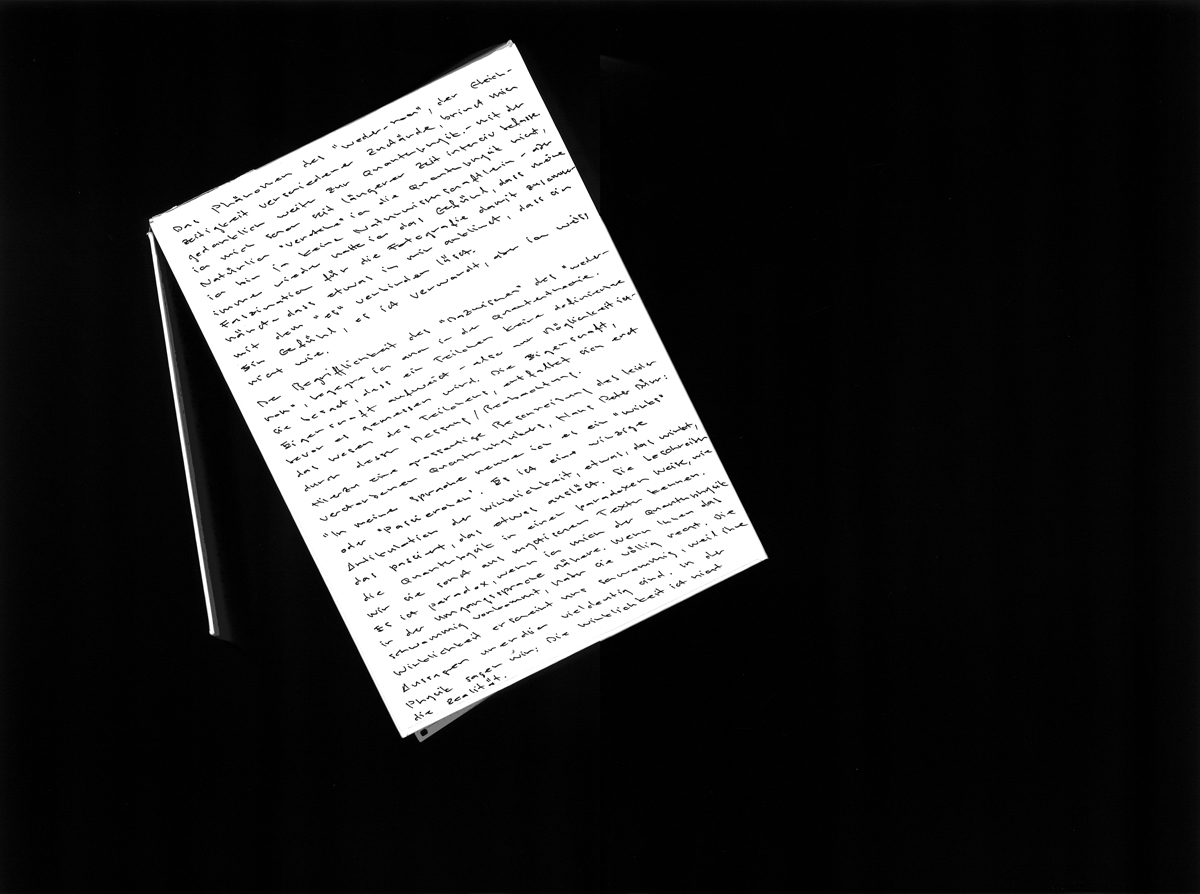P.s.: Ich betrachte eine alte Fotografie und bin gerührt. Das Licht aus dieser Zeit führt seinen weg in meine Netzhaut fort. Die Hände der Laborperson sprechen zu mir, wie auch das Material und die abgebildete Person. Sie war da, in diesem Moment, zu dieser Zeit. Dieses ungeheuerliche Gefühl des «es ist so gewesen» verweist jedoch auf keine Wahrheit. Es zeigt eben etwas anderes…
